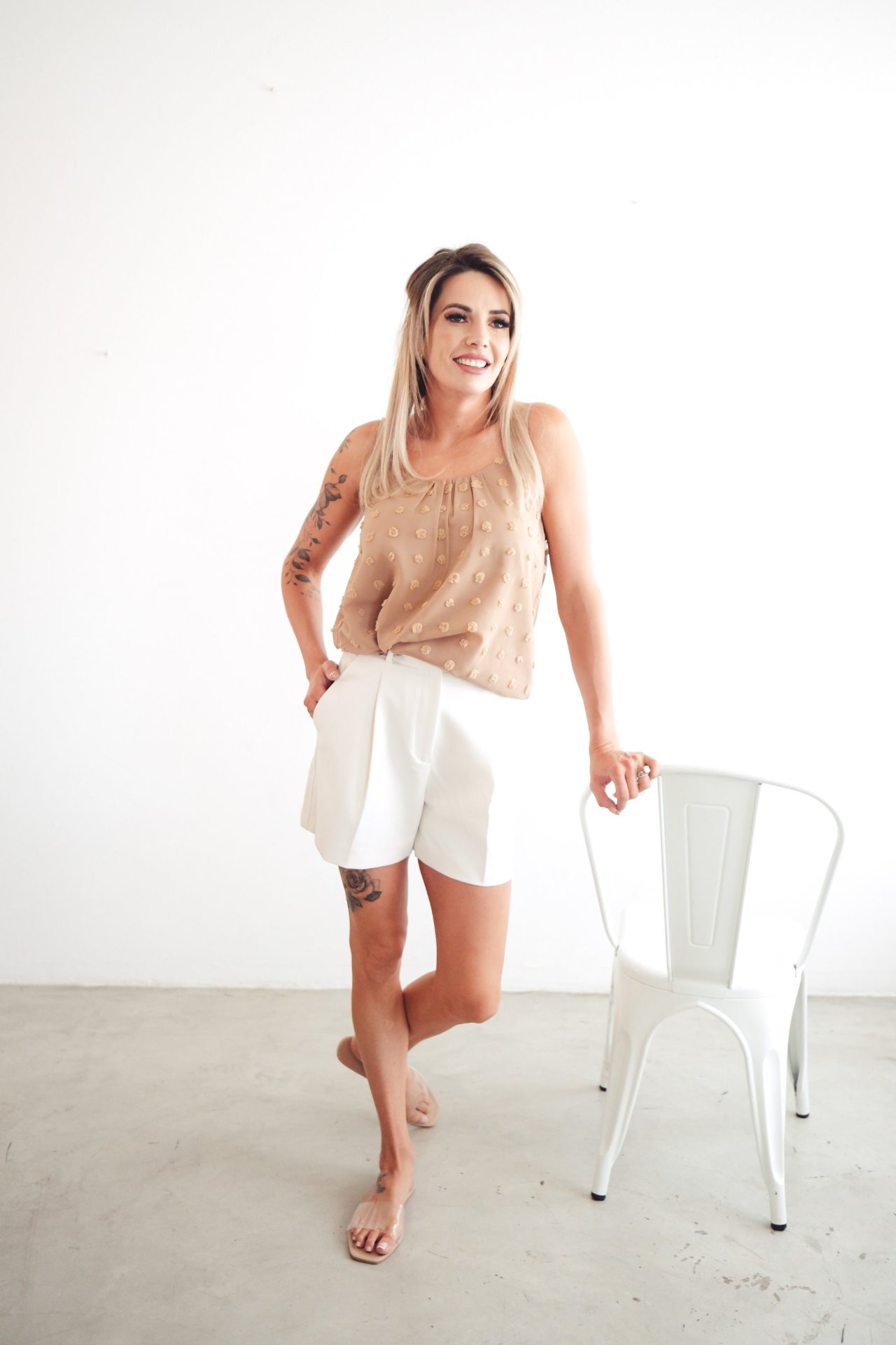 This classic, swiss dot tank will definitely help you turn up any outfit! Its going to look fabulous on its own  or layered! This is the perfect staple tank that every gal needs in her closet because it can be styled from season to season!